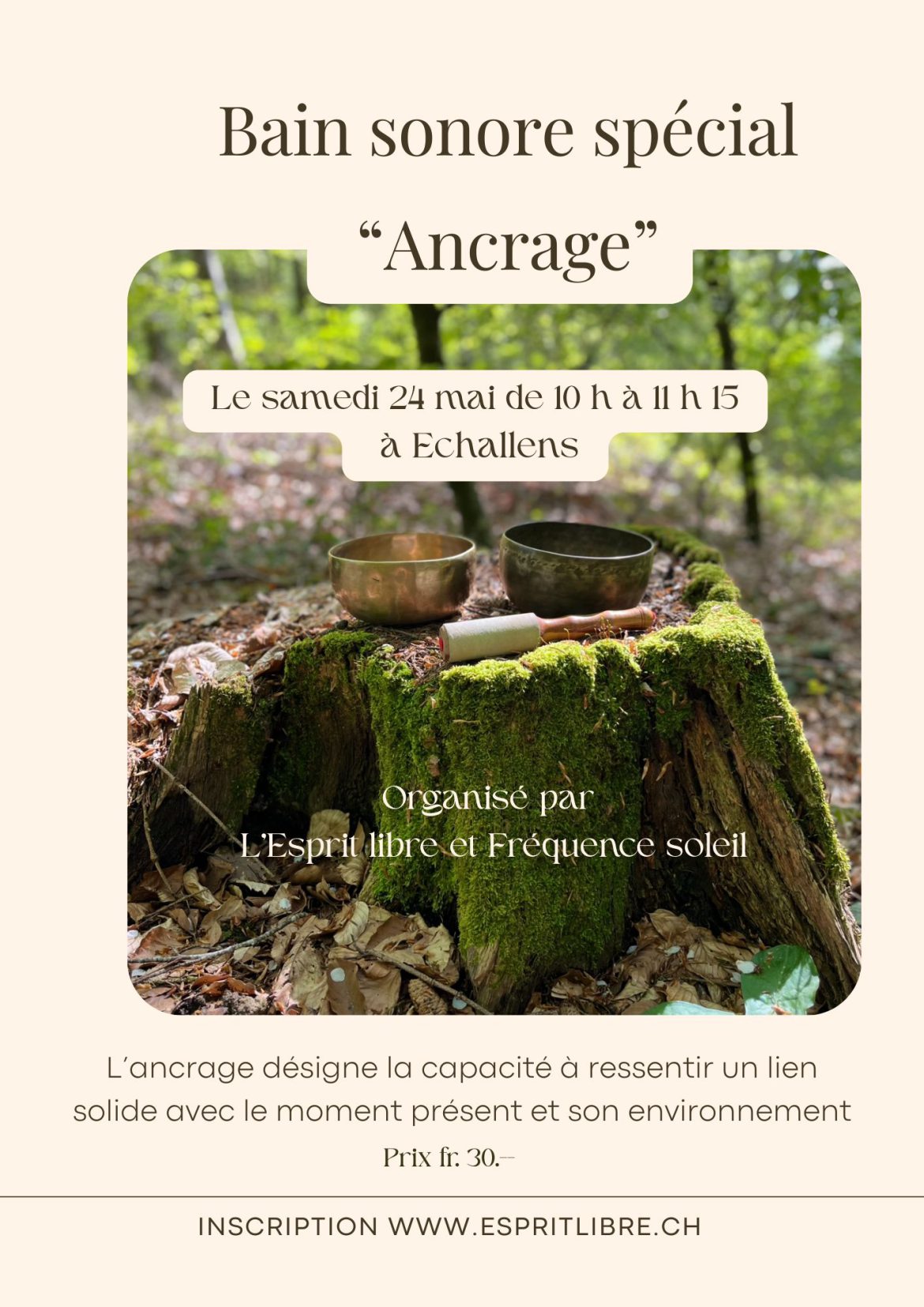L’ancrage désigne la capacité à ressentir un lien solide avec le moment présent et son environnement. Organisé par Fréquence Soleil et l’Esprit libre Prix CHF 30.-